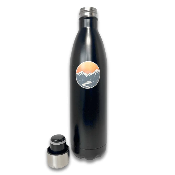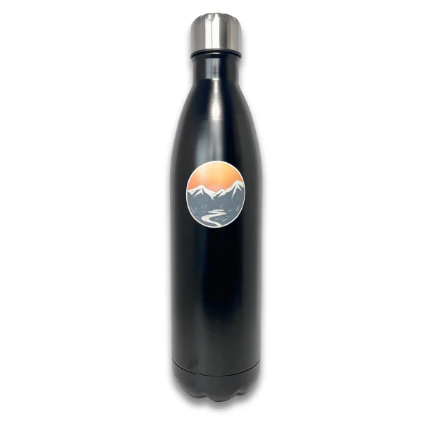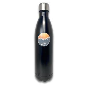 Czarna wersja butelki wyróżnia się bardziej zdecydowanym wyglądem. Matowa, ciemna powierzchnia w połączeniu z motywem górskim tworzy nowoczesny, outdoorowy styl, który trafia w gusta osób ceniących prostotę i charakter.