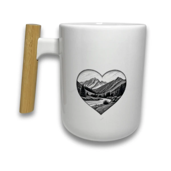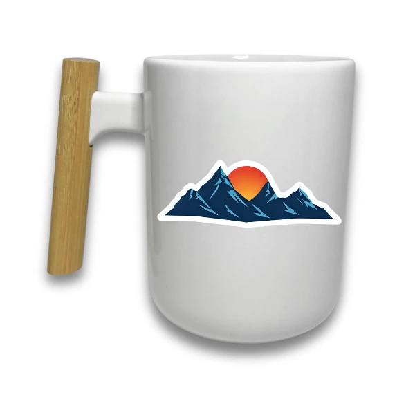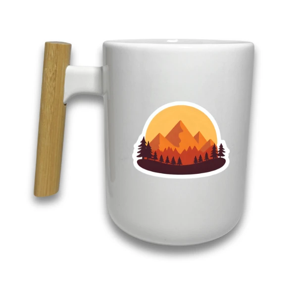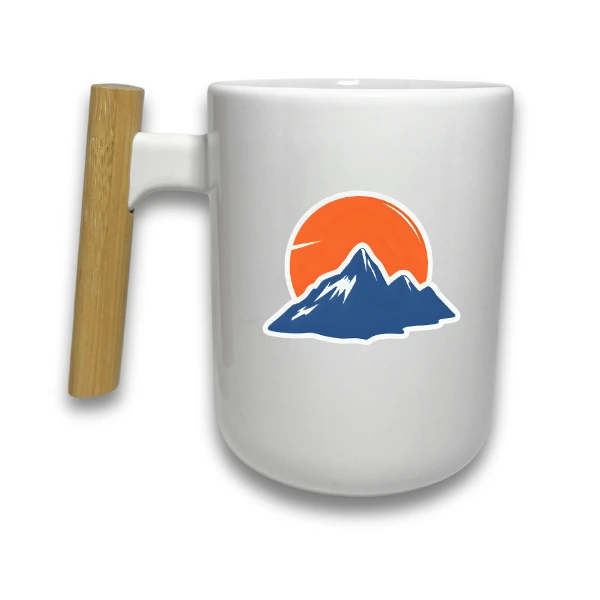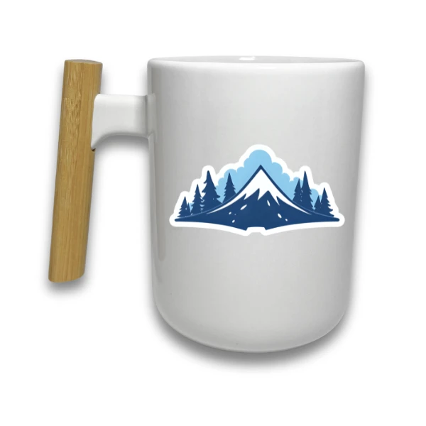 Stylowy kubek ceramiczny 480 ml z trwałym nadrukiem górskim w kilku motywach i wygodną bambusową rączką. Idealny do kawy, herbaty i jako prezent dla miłośników stylowego designu.