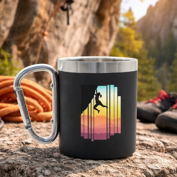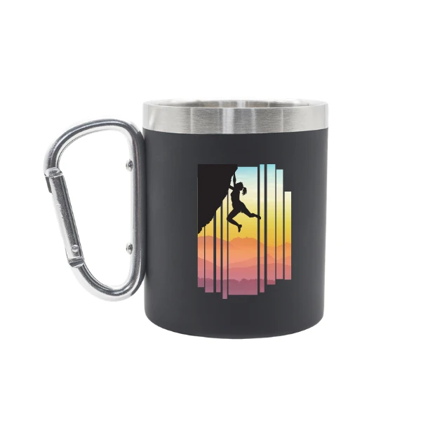 Kubek ze stali nierdzewnej z motywem górskim o pojemności 300 ml. Praktyczny kubek dla miłośniczki wspinania z uchwytem w kształcie karabińczyka. Idealny na kilkudniowe wypady wspinaczkowe.