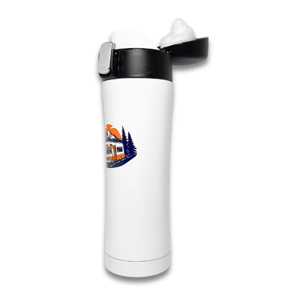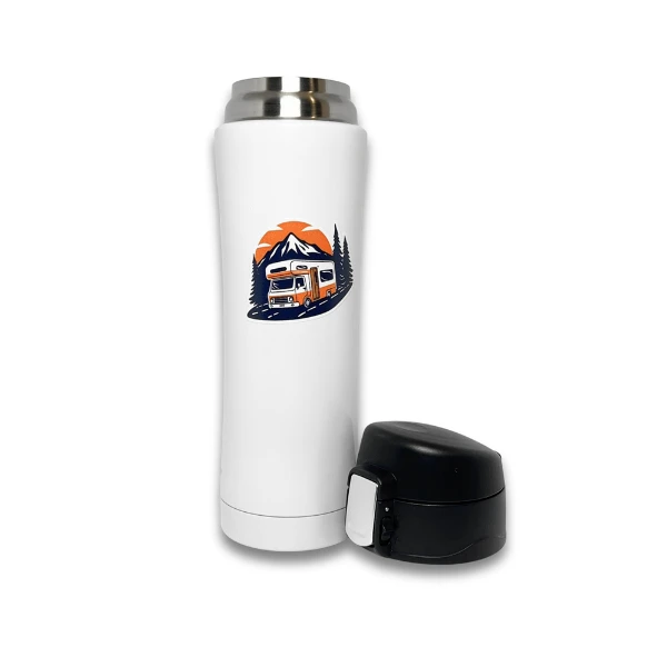 Kubek wykonany jest ze stali nierdzewnej i posiada konstrukcję z podwójnymi ściankami. Zastosowano szczelne zamknięcie z klapką i przyciskiem. Motyw graficzny przedstawia kampera w górskim krajobrazie, a nadruk wykonano w technologii UV DTF. Styl produktu jest podróżniczy, outdoorowy i nowoczesny.