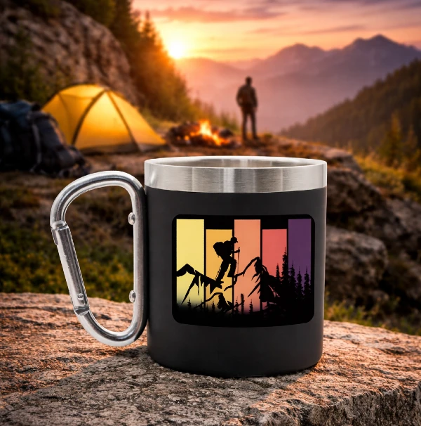 Metalowy kubek z nadrukiem dla fana trekingu i biwaków