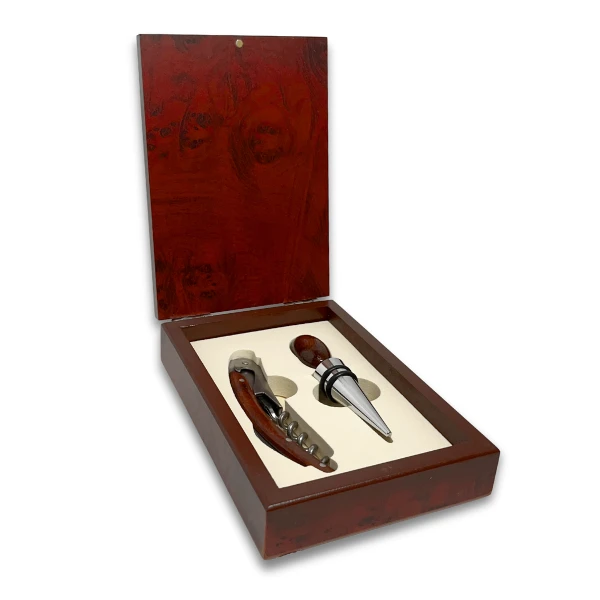 W środku znajdują się akcesoria przydatne podczas otwierania i serwowania wina. Całość została zaprojektowana tak, aby była wygodna w użytkowaniu i nie zajmowała dużo miejsca.